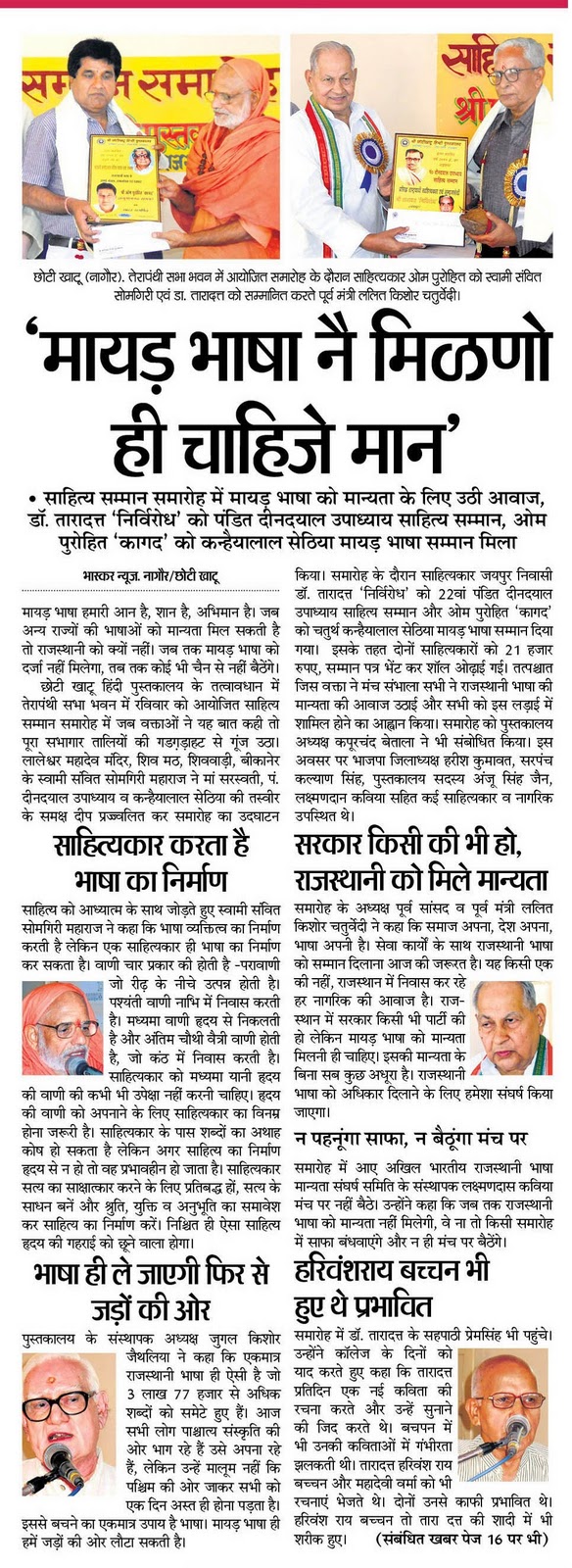 अखबार में कोई एक कॉलम कैसे शुरू होता है और कैसे हिट होता है इसे दैनिक भास्कर के श्रीगंगानगर एडिशन में नियमित प्रकाशित हो रहे 'आपणी भाषा-आपणी बात' स्तंभ की अंतरकथा जानकर ही अंदाज लगाया जा सकता है। यह स्तंभ मेरी अब तक की पत्रकारिता का यादगार प्रसंग तो है ही और इससे यह भी समझा जा सकता है कि हिंदी पत्रकारिता के सबसे बड़े दैनिक भास्कर पत्र समूह ने अपने संपादकों, स्टाफ को काम करने, नए प्रयोग की भरपूर आजादी भी दे रखी है। अपनी भाषा के प्रति क्या दर्द और क्या सम्मान होता है यह उज्जैन (मध्यप्रदेश) से उदयपुर (राजस्थान) स्थानांतरण के बाद ही समझ आया। जैसे गांधीजी ने आजादी के लिए अकेले संघर्ष शुरू किया और लोग जुड़ते गए। कुछ वैसा ही राजस्थानी भाषा को मान्यता दिलाने के आंदोलन को राजेंद्र बारहठ, शिवदान सिंह जोलावास, घनश्यामसिंह भिंडर आदि से थोड़ा बहुत समझ पाया। इसे एक दिल से जुड़े मुद्दे के रूप में उदयपुर में 'मायड़ भाषा' स्तंभ से शुरू किया और राजस्थान की भाषा संस्कृति की रक्षा के लिए सर्वस्व न्यौछावर करने को आतुर लोगों ने मान लिया कि संवैधानिक दर्जा दिलाना अब भास्कर का मुद्दा हो गया है। अप्रैल 08 में उदयपुर से श्रीगंगानगर स्थानांतरण पर इस मुद्दे को उठाने की छटपटाहट तो थी, लेकिन पहली प्राथमिकता थी दोनों शहरों का मिजाज समझना। एक शाम मोबाइल पर अखिल भारतीय राजस्थानी भासा मान्यता संघर्ष समिति के प्रदेशाध्यक्ष हरिमोहन सारस्वतजी ने संपर्क किया। वो मेरे लिए नए थे, लेकिन उन्होंने जिस तरह बारहठ जी और बाकी परिचितों के नाम के साथ बातचीत शुरू की तो मुझे लग गया कि मैं यहां नया हो सकता हूं लेकिन मेरी पहचान कई लोगों को करा दी गई है। सारस्वतजी से संपर्क बना रहा, आग्रह करते रहे कि सूरतगढ़ आएं। ब्यूरो कार्यालय की बैठक आदि के संदर्भ में जाना हुआ भी, लेकिन उनसे मुलाकात का वक्त नहीं निकाल पाया। एक शाम तो राजस्थानी मनुहार में हरिमोहन जी ने आदेश सुना ही दिया- सुगनचंद सारस्वत स्मृति में दिए जाने वाले वार्षिक साहित्यिक पुरस्कार समारोह में राजस्थानी भाषा के युवा कवि-परलीका के विनोद स्वामी को सम्मानित करने आना ही है। इंकार कर नहीं सकता था। फिर भी कह दिया अच्छा आप गाड़ी भिजवा देना फिर देखेंगे। कार्यक्रम से एक दिन पहले फिर मैसेज आ गया श्रीगंगानगर से ही राजकीय महाविद्यालय के हिन्दी विभागाध्यक्ष डॉ. अन्नाराम शर्मा और युवा साहित्यकार कृष्ण कुमार आशु (राजस्थान पत्रिका) आपको साथ लेकर आएंगे। अब तो न जाने के सारे बहानों के रास्ते बंद हो चुके थे। कार्यक्रम राजस्थानी भाषा के सम्मान से जुड़ा था। सोचा मालवी में बोलूंगा लेकिन ठीक से बोलना आता नहीं और गलत तरीके से राजस्थानी बोलना मतलब बाकी लोगों का दिल दुखाना और खुद की हंसी उड़